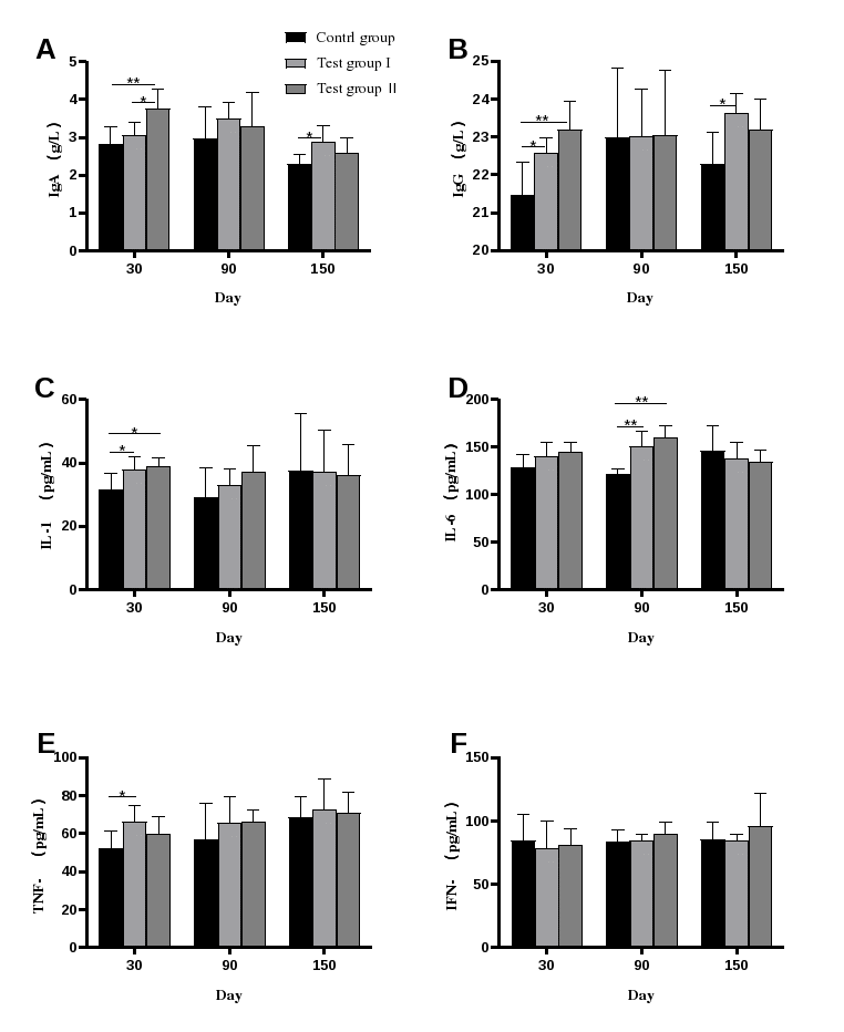 图1 补喂鼠李糖乳杆菌对马驹免疫机能的影响,注:图中A为血浆中IgA含量,B为血浆中IgG含量,C为血浆中IL-1β含量,D为血浆中IL-6含量,E为血浆中TNF-α含量,F为血浆中IFN-γ含量。图中“*”表示两组之间差异显著(P<0.05),“**”表示两组之间差异极显著(P<0.01),无标注表示没有显著差异(P>0.05)。