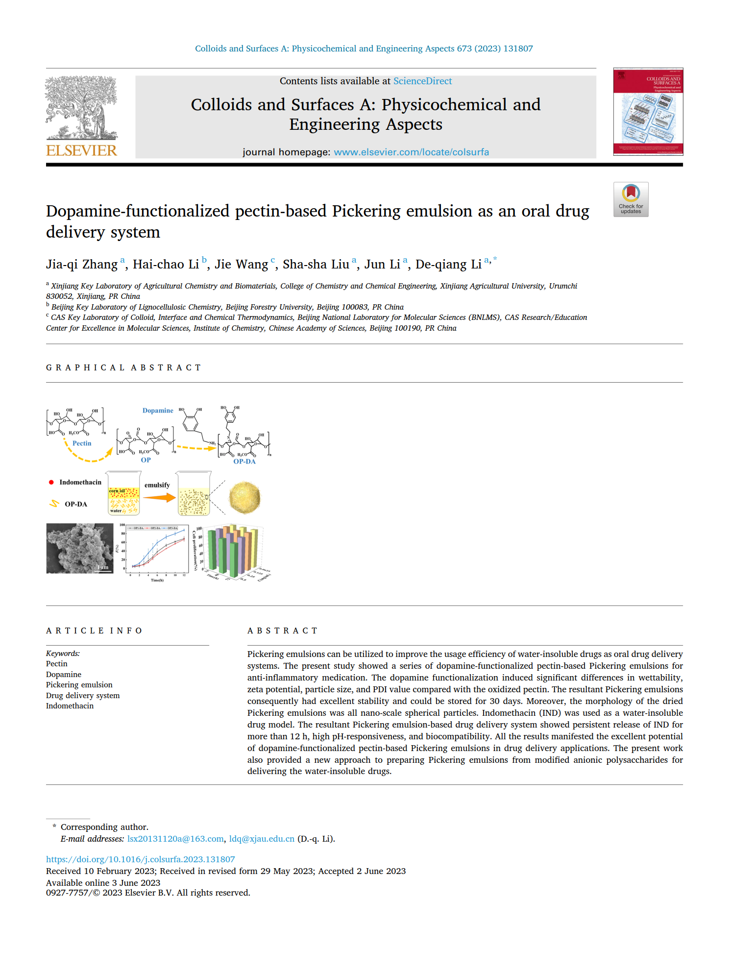 近日,99久久婷婷国产一区二区化学化工学院李德强副教授在Colloids and Surfaces A: Physicochemical and Engineering Aspects发表了一篇题为Dopamine-functionalized pectin-based Pickering emulsion as an oral drug delivery system的研究论文,研究了一系列多巴胺功能化的果胶基皮克林乳液用于亲脂药物的负载递送,该工作为其它杂多糖的改性及Pickering乳液的制备提供了新思路;另外,该方法可用于功能食品的开发领域。