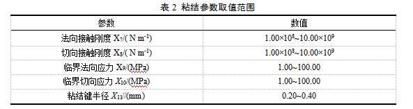 结合离散元仿真中农业物料和花类物料离散元仿真参数,将红花的法向和切向接触刚度数值在108 pa~1010 pa,临界法向和切向应力数值在1 Mpa~100 Mpa,粘结键半径数值在0.2~0.4,粘结参数取值范围如表2所示。