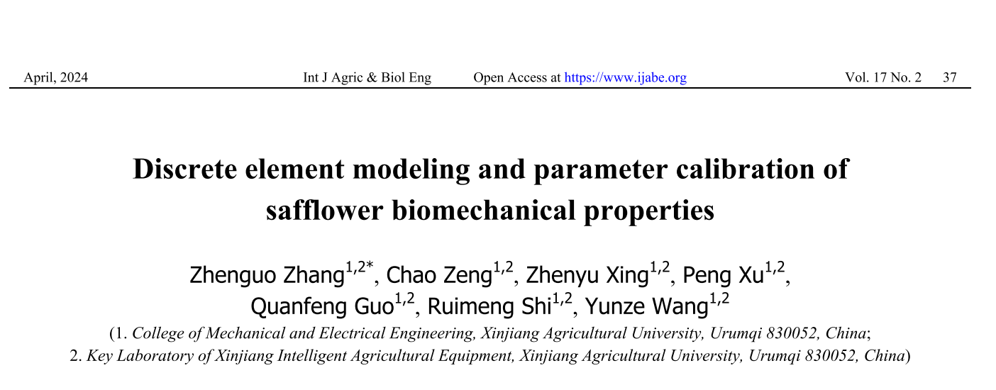 近日,99久久婷婷国产一区二区机电工程学院张振国副教授团队在International Journal of Agricultural and Biological Engineering在线发表一篇题为"Discrete element modeling and parameter calibration of safflower biomechanical properties"的研究论文。