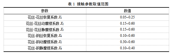 建立与堆积角试验相同的虚拟圆柱体(内径50mm、高300mm),圆柱体材料属性为钢,钢材料参数直接从EDEM软件素材库中提取:钢泊松比µs0.3、密度ρs7900 kg m-3和剪切模量Gs7.94×1010 Pa。并在圆柱体顶部设置颗粒工厂,结合离散元仿真中农业物料和花类物料离散元仿真参数,确定花丝接触参数的取值范围如表1所示。