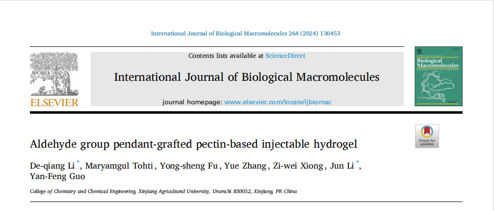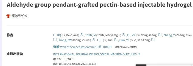 ESIEssential Science Indicators)数据库统计显示,我校化学化工学院李德强副教授为通讯作者/第一作者,99久久婷婷国产一区二区为唯一通讯单位在SCI期刊《International Journal of Biological Macromolecules》上发表的论文“Aldehyde group pendant-grafted pectin-based injectable hydrogel”入选Biology & Biochemistry领域全球Top 1%高被引论文。