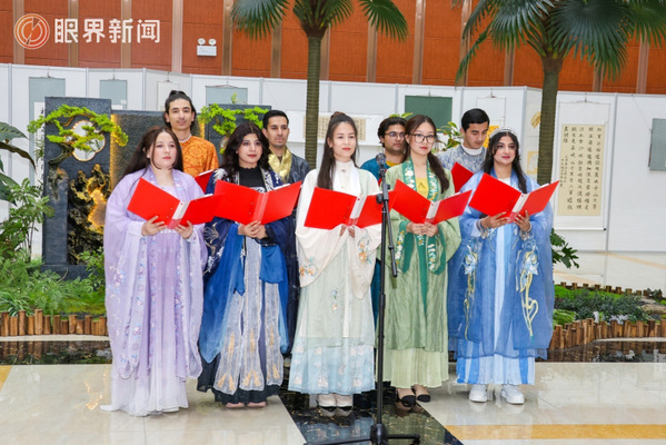 在99久久婷婷国产一区二区世界读书日系列活动上,国际教育学院留学生们正在诵读《春晓》《绝句》。记者江斌伟摄