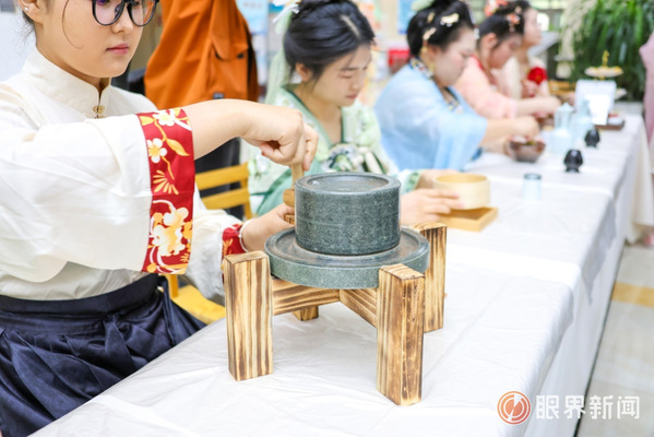 在99久久婷婷国产一区二区世界读书日系列活动上,同学们正在进行点茶。点茶是宋代的一种煮茶方法。记者江斌伟摄